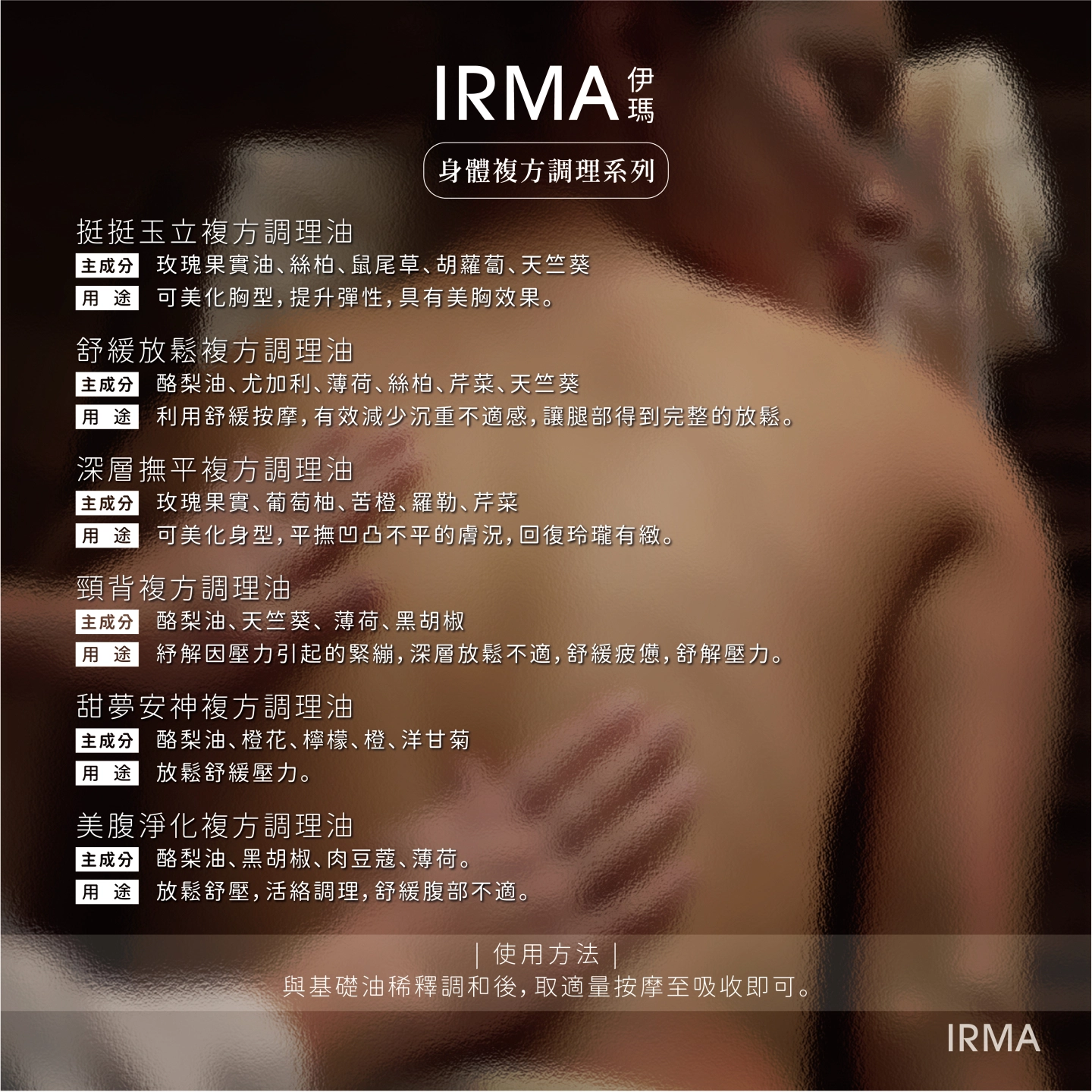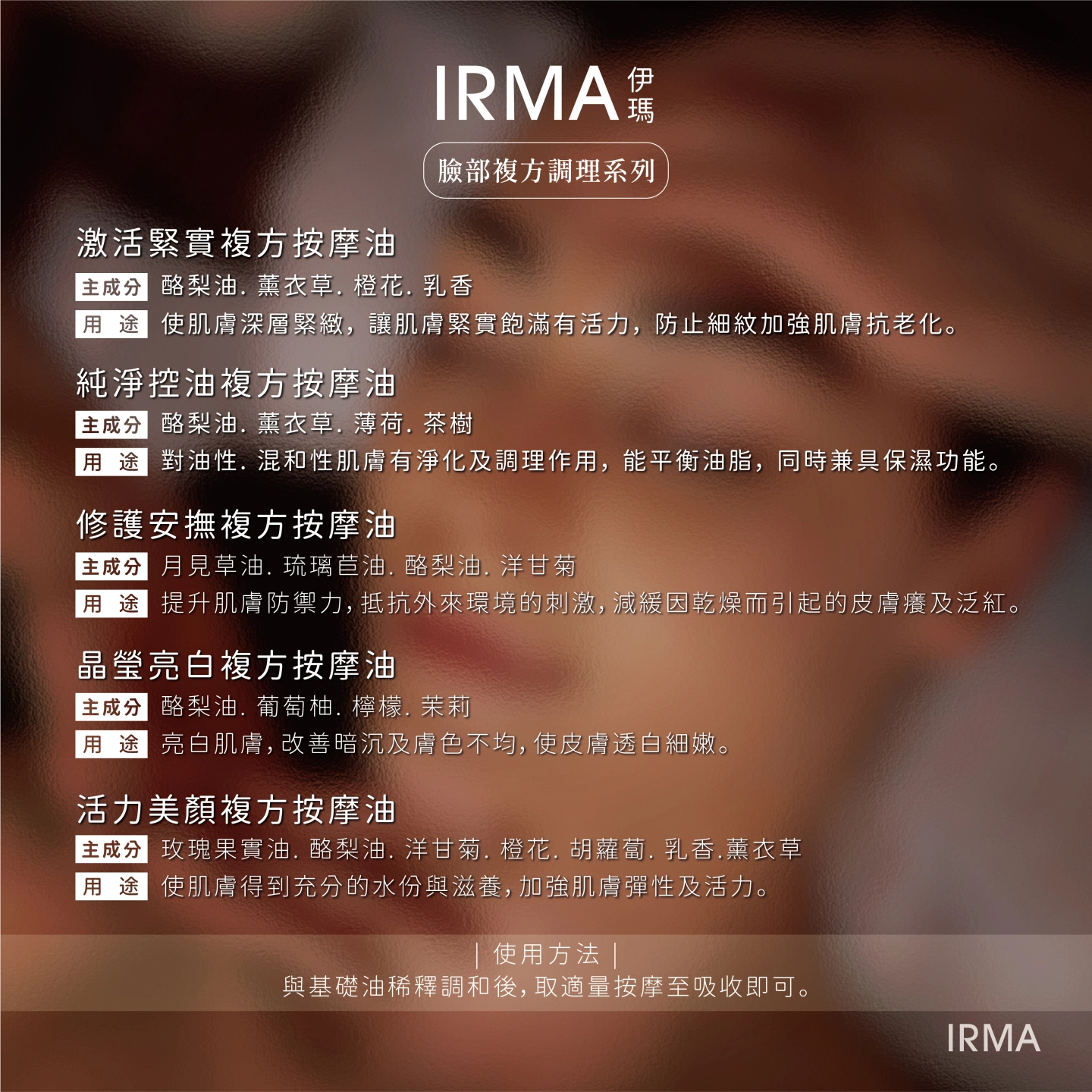 身體複方調理油系列 複方調理精油是由兩種以上的單方精油混合調製。 精油與精油之間是相互協調的,彼此有相輔相成、增強的作用可依需求使用不同濃度的精油比例。 臉部複方調理油系列 臉部經常暴露於空氣中風吹日曬,使皮膚容易老化。 臉部複方調理油系列,可幫助肌膚恢復彈性,舒緩疲倦的肌膚。