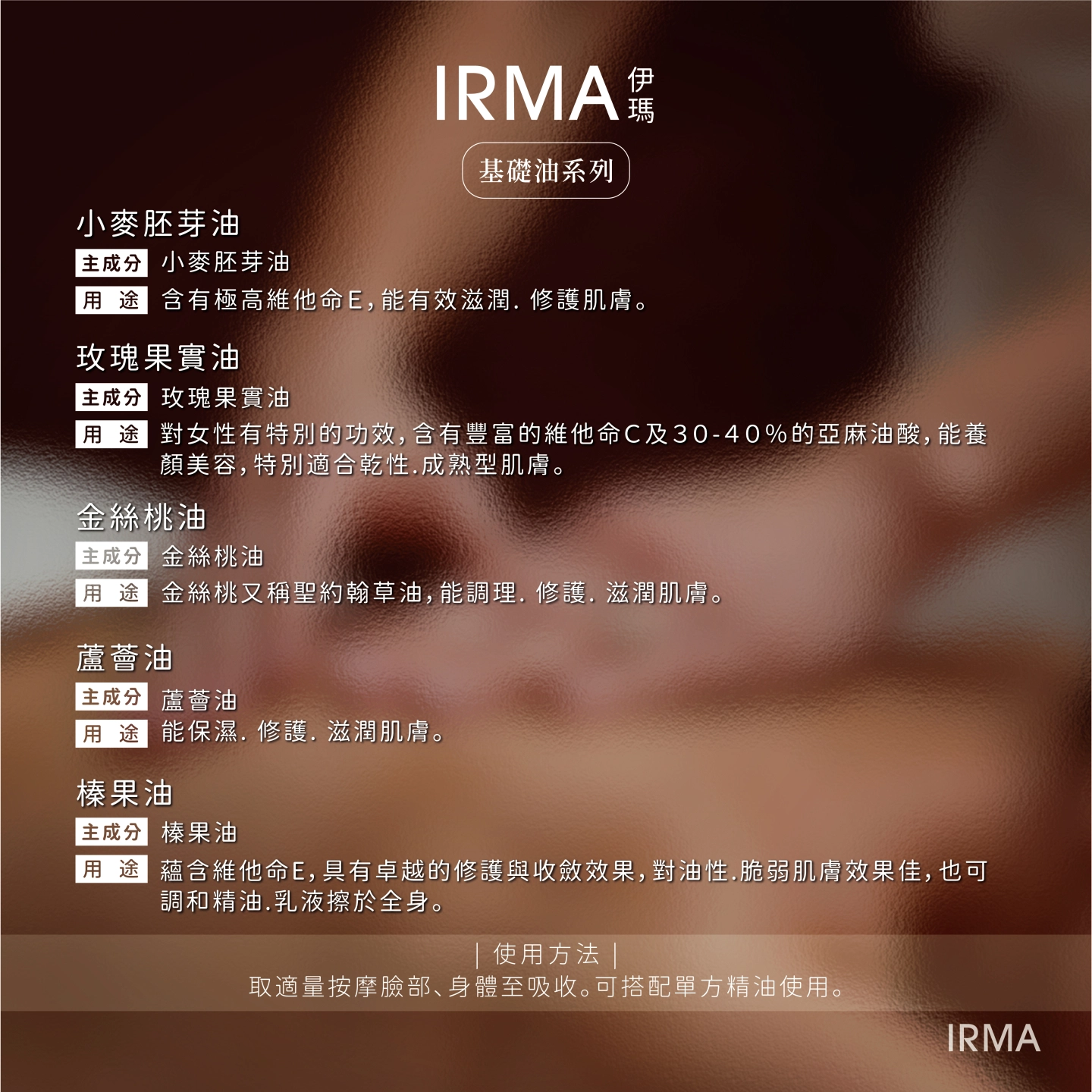 基礎油又稱植物油,可用來稀釋精油,因爲精油的濃度高,刺激性強,直接擦在皮膚上,會造成傷害,所以精油在使用前,一定要先稀釋。 基礎油是將各種植物的種子、果實經由壓榨後,所萃取的油脂,可以做爲皮膚保養用油,也是制作按摩油的基礎油。